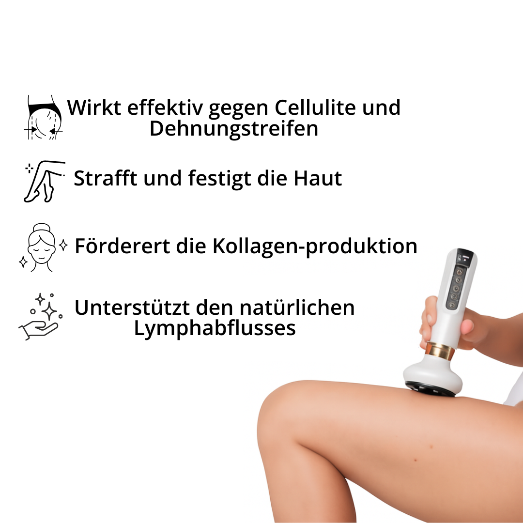 Ob Cellulite, Dehnungsstreifen, schlaffe Haut oder ein unebenes Hautbild – unser Massagegerät hilft deiner Haut, sich sichtbar zu regenerieren. Sanft, effektiv und ganz ohne Aufwand.
