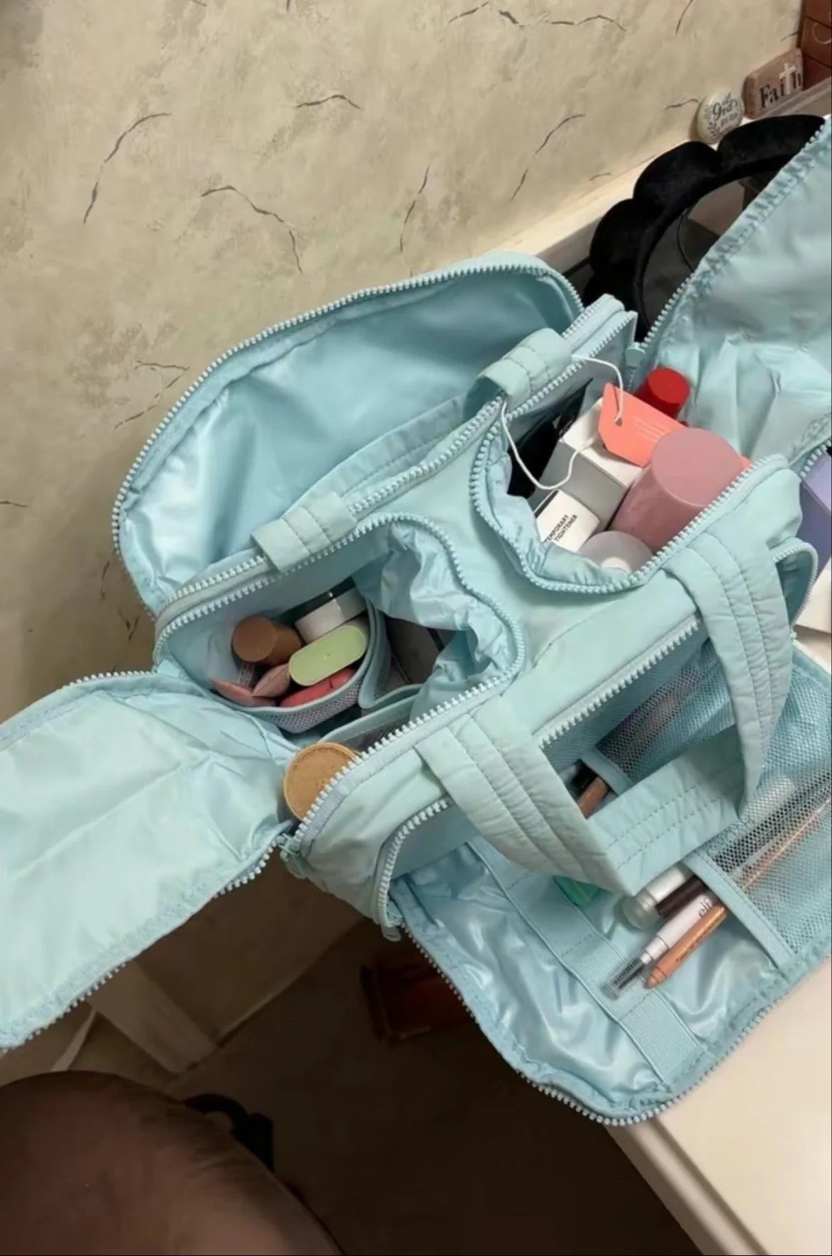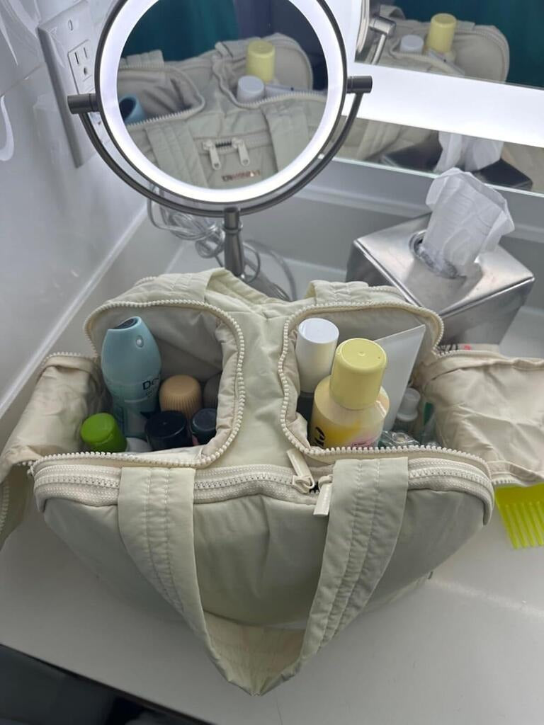 Stylisch und weich. Selbst meine großen Produkte passen problemlos rein und sie hat sofort meine alte Tasche ersetzt. Perfekt für Kurztrips und kleine Auszeiten.