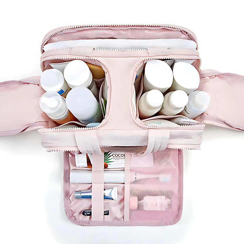 Mehrere Fächer: Zwei Hauptfächer und zwei Fronttaschen mit Reißverschluss bieten zusätzliche Steckplätze und Netztaschen – perfekt für Make-up-Pinsel, Zahnbürste und vieles mehr. So bleibt alles organisiert und schnell griffbereit.